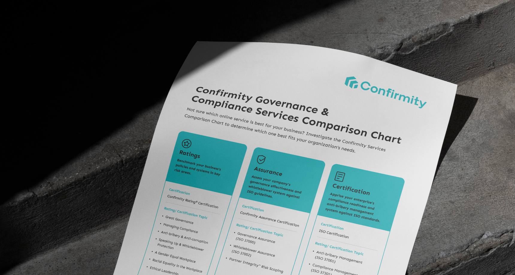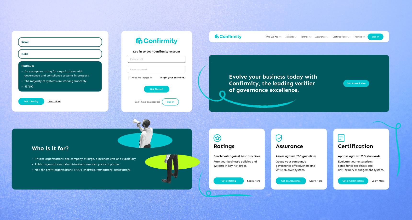 The brand identity, rooted in their structured service delivery, features a logo that represents the alignment of business elements. Bright colors highlight the dynamic nature of Confirmity’s services.